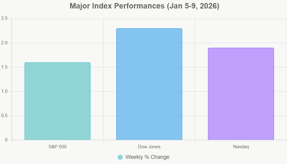 - Strong Start to the Year: The S&P 500 rose 1.6%, the Dow Jones Industrial Average gained 2.3%, and the Nasdaq climbed 1.9%, with many indexes achieving record closes by week's end.